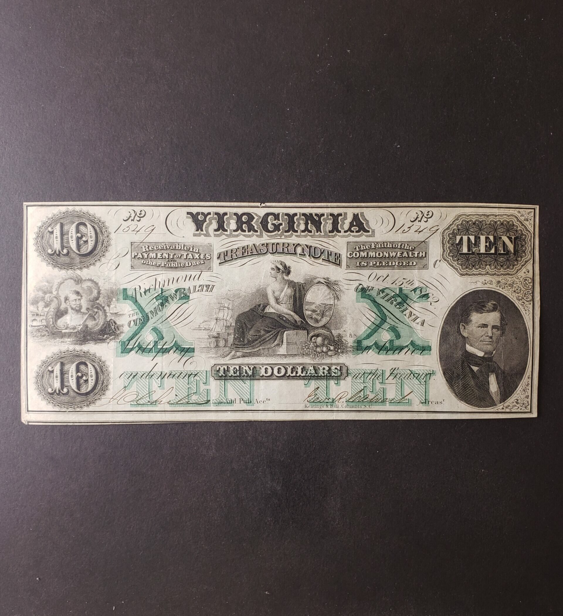 1862 $10 Virginia Treasury Note Obsolete Currency.