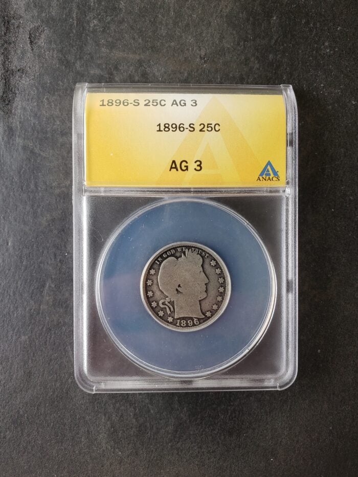 Be the first to review “1896 S 25c Barber Silver Quarter Dollar ANACS AG3”
